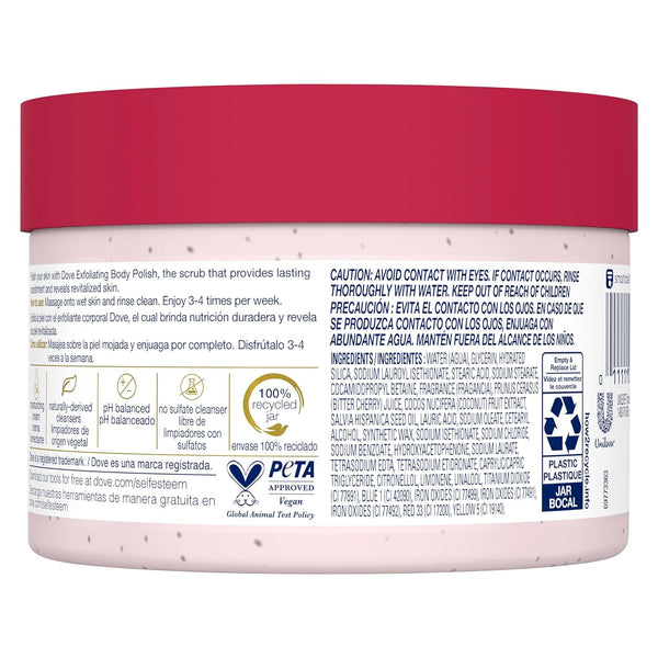 Revitalize your skin and senses with Dove Exfoliating Body Polish. This exfoliating body polish, with 1/4 moisturizing cream, provides lasting nourishment to reveal revitalized skin. Infused with crushed cherries and chia milk, this body polish gently exfoliates, cleanses, and nourishes your skin and provides complete skin care. Your skin will feel as soft as it looks. This exfoliating body scrub contains sulfate-free cleansers, is vegan and is in a 100% recycled jar. You can feel good about switching to Dove skin cleansing. How to use: Scoop a generous amount of Dove Body Polish into your palms. Massage this full body scrub onto wet skin and rinse clean. Enjoy 3-4 times per week. At Dove, our vision is of a world where beauty is a source of confidence, and not anxiety. We are on a mission to help the next generation of women develop a positive relationship with the way they look—reaching over 1/4 of a billion young people with self-esteem education by 2030. We are also committed to a landmark new initiative as part of our 2025 commitment to reduce plastic waste; reducing over 20,500 metric tons of virgin plastic annually by making the iconic beauty bar packaging plastic-free globally; launching new 100% recycled plastic bottles; and trialing a new refillable deodorant format that radically reduces plastic use. As one of the largest beauty brands in the world, we are revealing an agenda-setting commitment to tackle the global beauty industry’s plastic waste issue.
