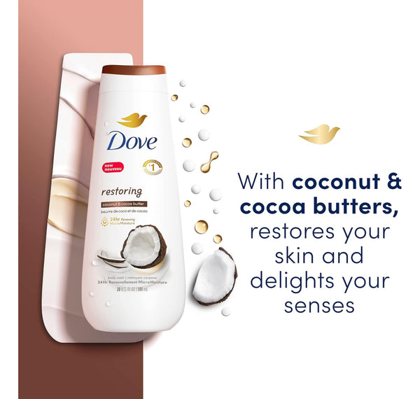 - 24HR RENEWING MICROMOISTURE: Dove Restoring Coconut & Cocoa Butters Body Wash gently cleanses and nourishes the skin, leaving it renewed and healthy-looking for 24 hours
