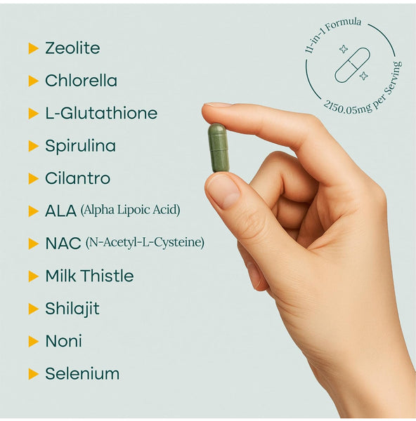 - 11-in-1 Advanced Detox Complex] - A synergistic blend of Zeolite, Chlorella, NAC, Glutathione, Milk Thistle, and more. Designed to support the body’s natural detoxification and cellular cleansing systems.