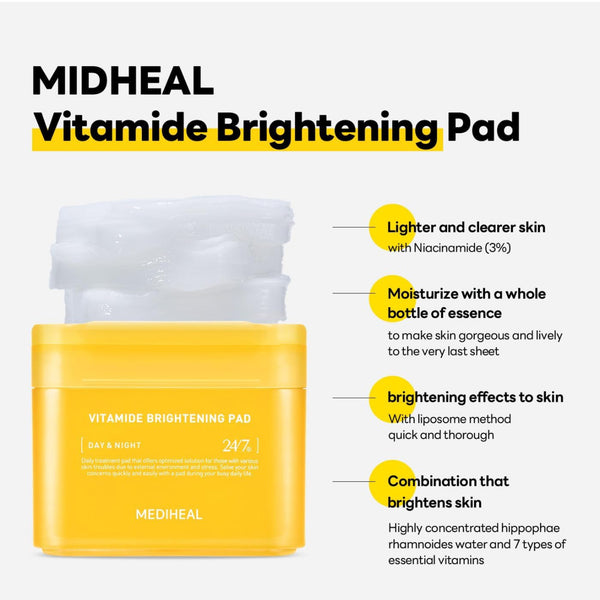 ⚪[HELP IMPROVE SKIN TONE] : Mediheal Vitamide Pads contain vitamin tree water, seven essential vitamins, and niacinamide.